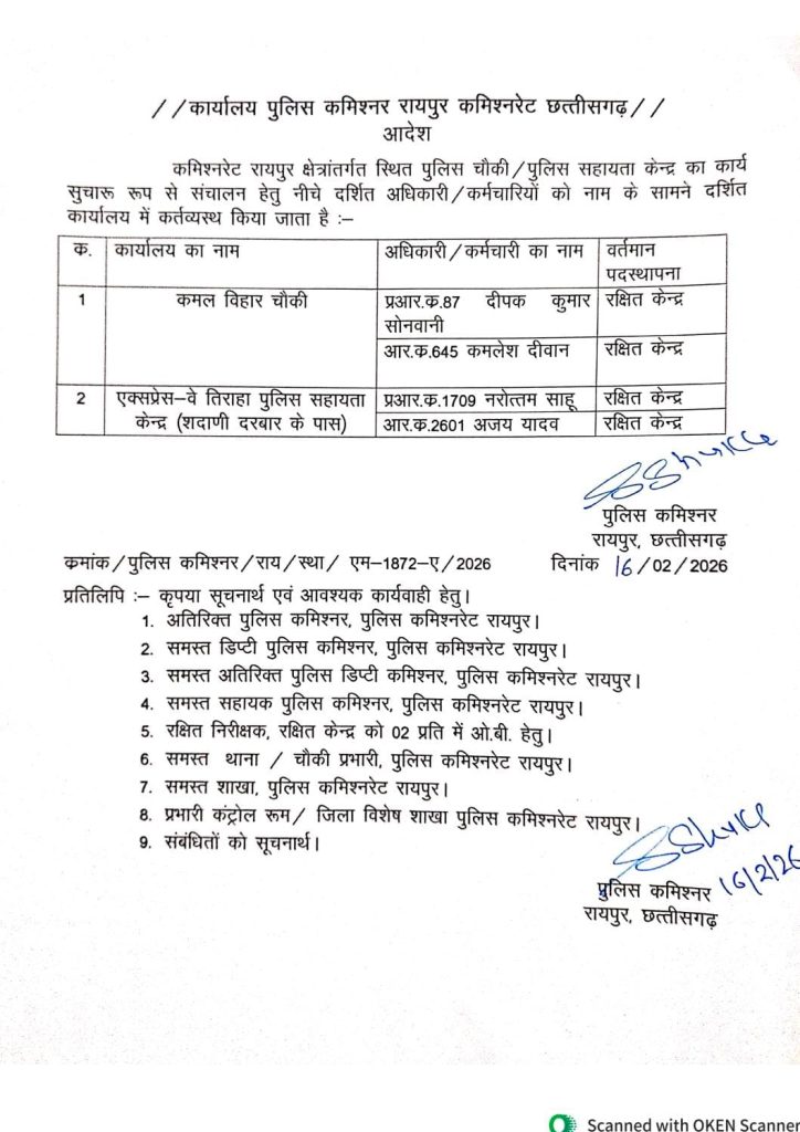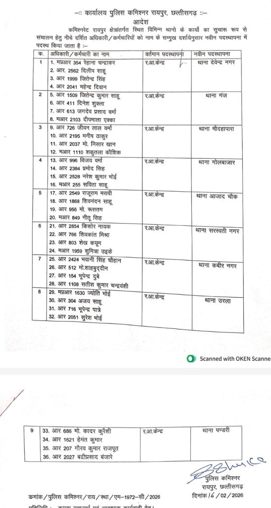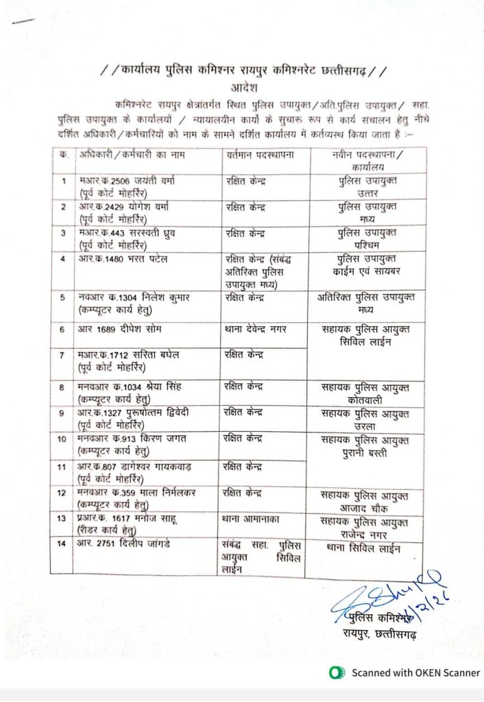 देवेंद्रनगर, गंज, मौदहापारा,गोल बाजार,आजाद चौक,सरस्वती नगर, कबीर नगर, उरला, पंडरी थानों में चार-चार आरक्षकों को रक्षित केंद्र से भेजा गया है। इनमें महिला आरक्षक भी शामिल हैं। वहीं कमल विहार चौकी और एक्सप्रेस वे– तिराहा पुलिस चौकी केंद्र में भी रक्षित केंद्र से एक-एक एएसआई,एक-एक प्रधान आरक्षक और चार-चार आरक्षकों की पोस्टिंग की गई है।