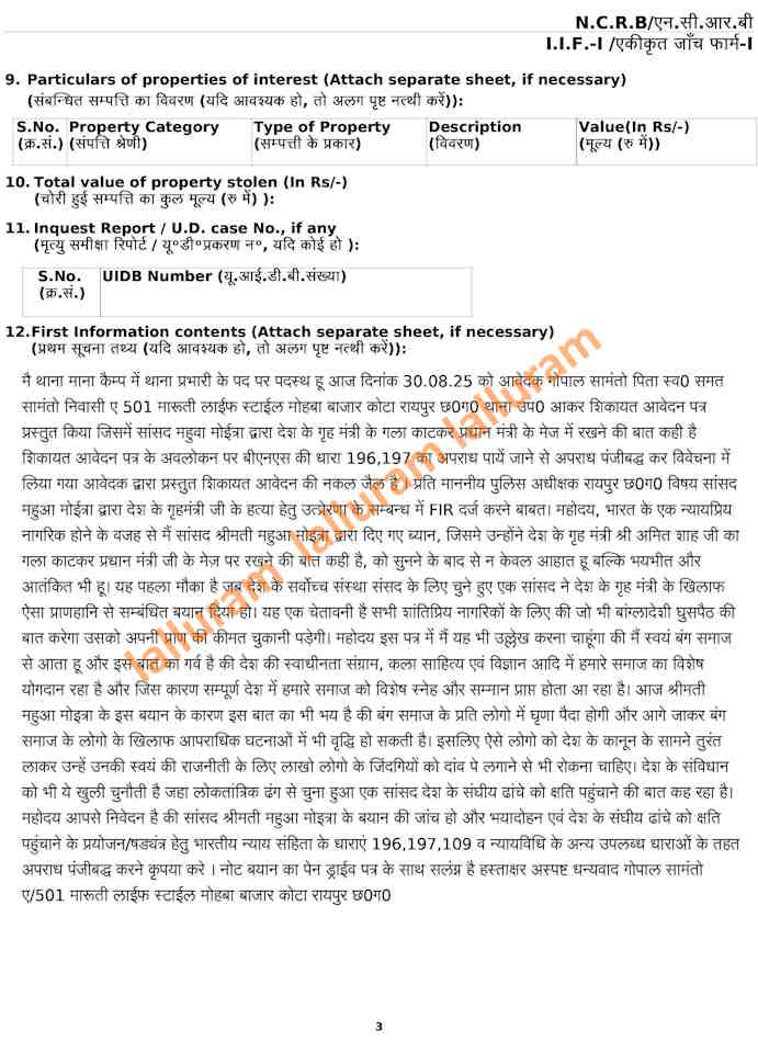 जानकारी के अनुसार, मोहबा बाजार, कोटा निवासी गोपाल सामंतो ने माना पुलिस में टीएमसी सांसद महुआ मोइत्रा के खिलाफ शिकायत दिया था. पुलिस अधीक्षक के नाम से दी गई शिकायत में कहा कि सांसद महुआ मोइत्रा ने देश के गृह मंत्री अमित शाह का गला काटकर प्रधानमंत्री के मेज पर रखने की बात को सुनने के बाद से न केवल आहत हूं, बल्कि भयभीत और आतंकित भी हूं, यह पहला मौका है जब एक सांसद ने देश के गृह मंत्री के खिलाफ ऐसा बयान दिया हो. यह एक चेतावनी है उन सभी शांतिप्रिय नागरिकों के लिए कि जो भी बांग्लादेशी घुसपैठ की बात करेगा उसको अपनी प्राण की कीमत चुकानी पड़ेगी.