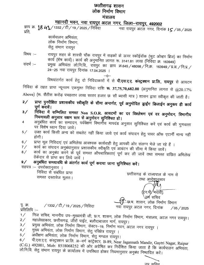 बता दें कि करीब 8 सालों से अधूरे खड़े स्काई वॉक के ढांचे को पूरा करने के लिए लोक निर्माण विभाग (PWD) ने टेंडर प्रक्रिया पूरी कर ली है। इसका नोटिफिकेशन भी जारी हो गया है, जिसके अनुसार, पी.एस.ए.ए. कंस्ट्रक्शन प्रा. लि. रायपुर को इस परियोजना का ठेका दिया गया है। कंपनी ने अनुमानित लागत ₹31.41 करोड़ से 20.17% अधिक दर यानी ₹37,75,70,682.00 (₹37.75 करोड़) की दर से निविदा भरी थी, जिसे शासन से स्वीकृति मिल चुकी है।
