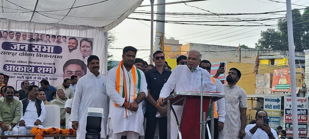 रायपुर। रायपुर दक्षिण विधानसभा उपचुनाव को लेकर कांग्रेस ने अपनी पूरी ताकत झोंक दी है. पूर्व मुख्यमंत्री भूपेश बघेल और प्रदेश कांग्रेस अध्यक्ष दीपक बैज ने आज अलग-अलग जगहों में जनसभा को संबोधित किया. भूपेश बघेल ने तीन जनसभाएं चंगोराभाठा, कुशालपुर और सिविल लाइन में की. वहीं पीसीसी चीफ बैज ने पुरानी बस्ती में जनसंपर्क किया और सिविल लाइन वार्ड श्याम नगर में जनसभा को संबोधित किया. इस दौरान दोनों नेताओं ने भाजपा सरकार पर जमकर हमला बोला और कांग्रेस प्रत्याशी आकाश शर्मा के पक्ष में वोट की अपील की.