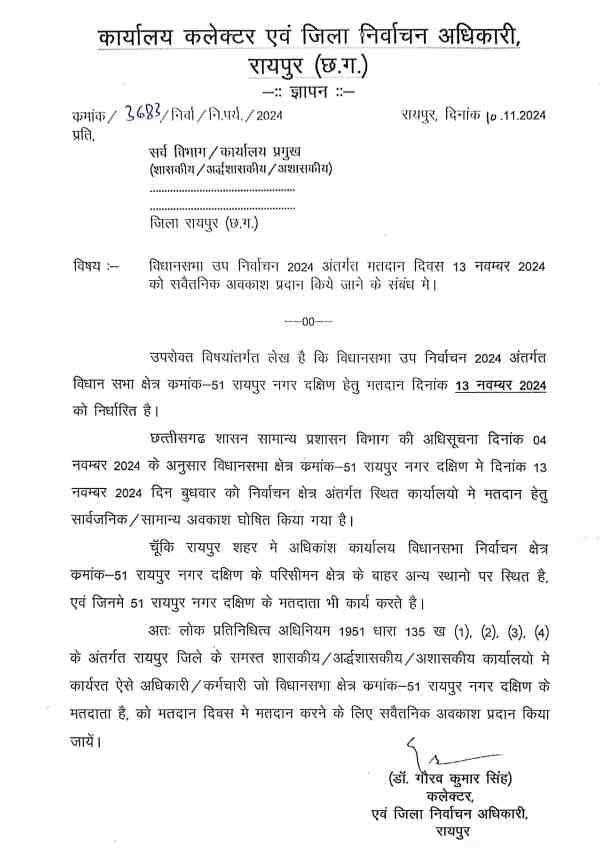 रायपुर. रायपुर दक्षिण विधानसभा उपचुनाव 2024 के तहत 13 नवंबर दिन बुधवार को मतदान होगा. इस दिन निर्वाचन क्षेत्र अंतर्गत स्थित कार्यालयों में मतदान के लिए सार्वजनिक अवकाश और सामान्य अवकाश की घोषणा की गई है. इसका आदेश रायपुर कलेक्टर डॉ. गौरव सिंह ने जारी किया है.