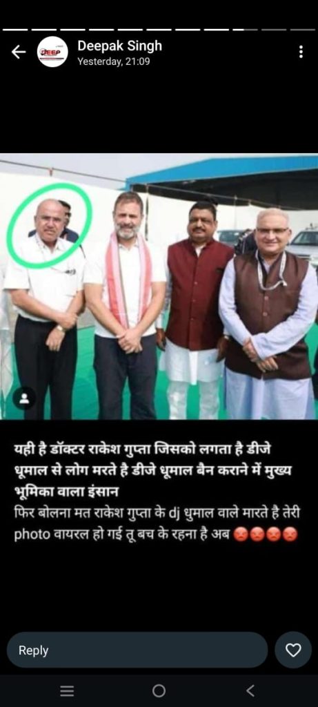 जिस फोटो को वायरल किया जा रहा है उसमें डॉ राकेश गुप्ता सांसद राहुल गांधी (Rahul Gandhi) के साथ नजर आ रहे है. इस पोस्ट के वायरल होने के बाद डॉ राकेश गुप्ता ने रायपुर एसएसपी (Raipur SSP) से इसकी शिकायत की है और उन्होंने सुरक्षा की भी मांग की है. (Dr. Rakesh Gupta received threat)