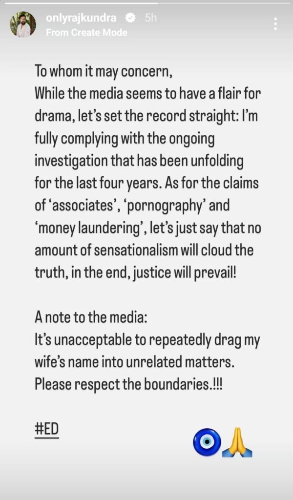 एक्ट्रेस शिल्पा शेट्टी (Shilpa Shetty) और राज कुंद्रा (Raj Kundra) के घर और दफ्तर पर 29 नवंबर को पोर्नोग्राफी मामले में ईडी (ED) ने छापेमारी की है. इसके बाद राज कुंद्रा (Raj Kundra) ने इंस्टाग्राम स्टोरी पर एक पोस्ट शेयर किया है. इस पोस्ट में उन्होंने बताया कि वे जांच एजेंसियों के साथ पूरी तरह से सहयोग कर रहे हैं. लेकिन पत्नी का नाम बार-बार गैर जरूरी मामलों में लेना सही नहीं है.