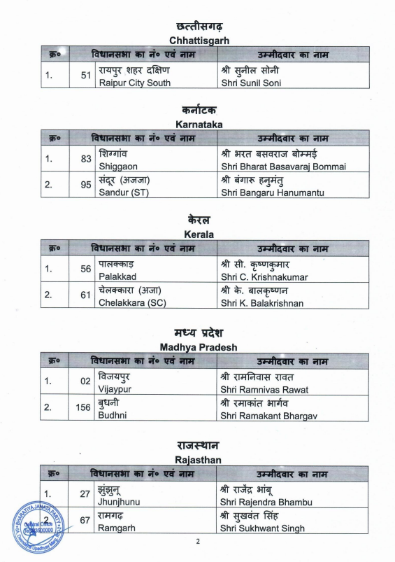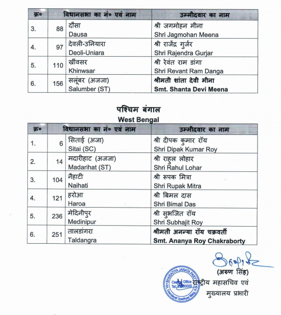 केंद्रीय चुनाव आयोग की बैठक के बाद भाजपा ने अपने प्रत्याशियों की सूची जारी की है। इस सूची के अनुसार, देवली-उनियारा सीट पर बदलाव करते हुए पूर्व विधायक राजेंद्र गुर्जर को मैदान में उतारा गया है। दौसा सीट से मंत्री किरोड़ी लाल मीणा के भाई जगमोहन मीणा को उम्मीदवार बनाया गया है। सलूंबर से दिवंगत अमृत लाल मीणा की पत्नी शांता देवी मीणा को टिकट मिला है, जबकि रामगढ़ से सुखवंत सिंह को फिर से उम्मीदवार बनाया गया है। सुखवंत सिंह 2018 में बीजेपी के उम्मीदवार रह चुके हैं, और 2023 में टिकट न मिलने पर उन्होंने निर्दलीय चुनाव लड़ा था।