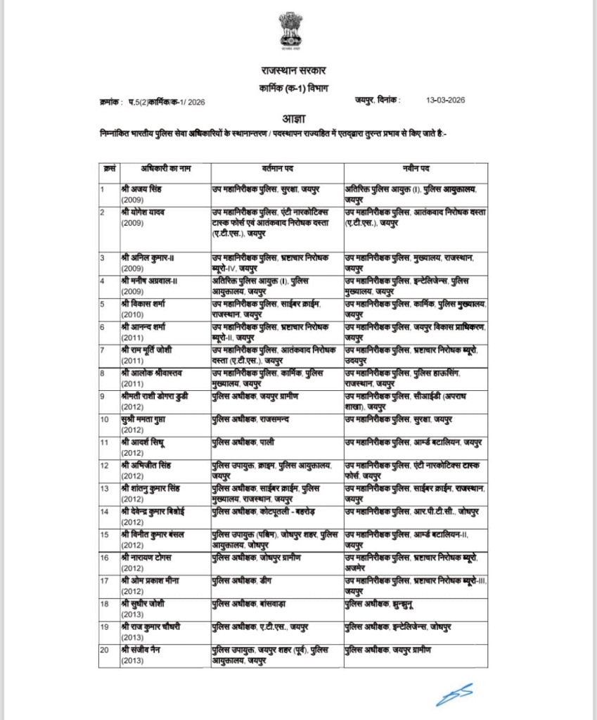 सिर्फ जिलों में ही नहीं, बल्कि राजधानी जयपुर और जोधपुर कमिश्नरेट में भी बड़े बदलाव किए गए हैं। जयपुर कमिश्नरेट के पुलिस बेड़े में कई पुलिस उपायुक्त (DCP) बदले गए हैं। वहीं, जोधपुर कमिश्नरेट में डीसीपी (पश्चिम) की जिम्मेदारी नए अधिकारियों को सौंपी गई है।