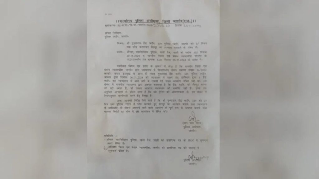एसपी ज्ञानचंद यादव ने बताया कि माननीय न्यायालय और पुलिस महानिरीक्षक के आदेश अनुसार हेड कांस्टेबल पूनमाराम को 7 दिन की ट्रेनिंग के लिए निर्देशित किया है। उन्हें आदेश के संदर्भ में 7 दिनों तक पुलिस लाइन में परेड करवाने और सैल्यूट का अभ्यास करने के लिए निर्देशि दिया गया है।