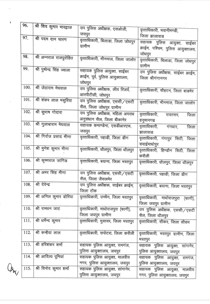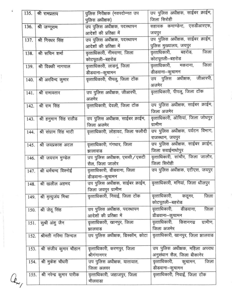 Rajasthan News: राजस्थान में पुलिस अधिकारियों के बड़े स्तर पर तबादले किए गए हैं। राजस्थान पुलिस मुख्यालय ने 180 डिप्टी सुपरिंटेंडेंट ऑफ पुलिस (DSP) के स्थानांतरण आदेश जारी किए हैं। इसके साथ ही कई सर्किल ऑफिसर (CO) और असिस्टेंट कमिश्नर ऑफ पुलिस (ACP) के पदों पर भी व्यापक फेरबदल किया गया है।