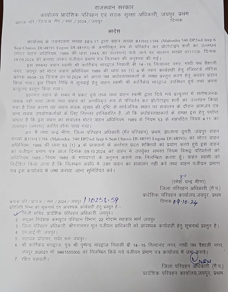 इस घटना के बाद परिवहन विभाग ने पहले जुर्माना लगाया और वाहन मालिक कार्तिकेय भारद्वाज को अनाधिकृत वाहन संशोधन के लिए नोटिस जारी किया था। अब, जिला परिवहन अधिकारी रमेश चंद मीणा ने आदेश जारी करते हुए वाहन का पंजीकरण प्रमाण पत्र निलंबित कर दिया है, क्योंकि वाहन के अनधिकृत परिवर्तन पाए गए। कार्तिकेय भारद्वाज को मोटर वाहन अधिनियम 1989 की धारा 53 (1) a के तहत नोटिस जारी किया गया था, लेकिन संतोषजनक जवाब नहीं मिलने पर यह कदम उठाया गया।