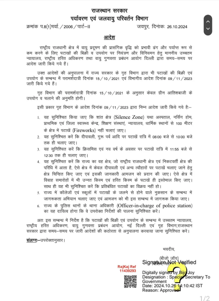 राजस्थान सरकार के आदेश के अनुसार, एनसीआर क्षेत्र में आने वाले राजस्थान के हिस्सों में त्यौहारों और शादी समारोहों के लिए ग्रीन पटाखों का उपयोग अनिवार्य किया गया है। दीपावली और गुरु पर्व पर रात 8 बजे से 10 बजे तक ही पटाखे चलाने की अनुमति होगी।