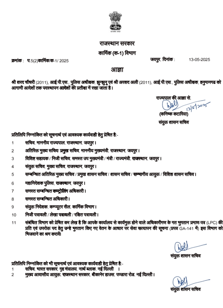 एपीओ किए गए अधिकारियों में झुंझुनू के एसपी शरद चौधरी और हनुमानगढ़ के एसपी अरशद अली शामिल हैं। शरद चौधरी 19 अगस्त 2024 से झुंझुनू में तैनात थे, जबकि अरशद अली ने 25 अगस्त 2024 से हनुमानगढ़ में एसपी का पदभार संभाला था।