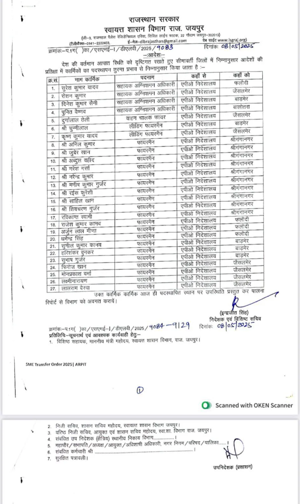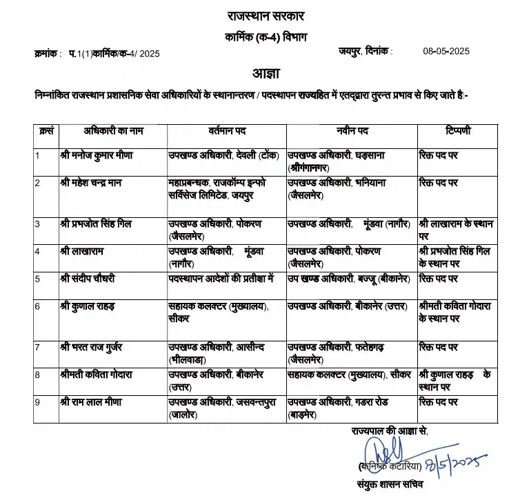 कार्मिक विभाग ने तत्काल प्रभाव से 9 RAS अधिकारियों के तबादलों के आदेश जारी किए हैं। महेश चंद्र मान को जैसलमेर के भनियाना का उपखण्ड अधिकारी नियुक्त किया गया है। इसी तरह, फतेहगढ़ में भरत राज गुर्जर और बीकानेर (उत्तर) में कुणाल राहड़ को उपखण्ड अधिकारी की जिम्मेदारी दी गई है।