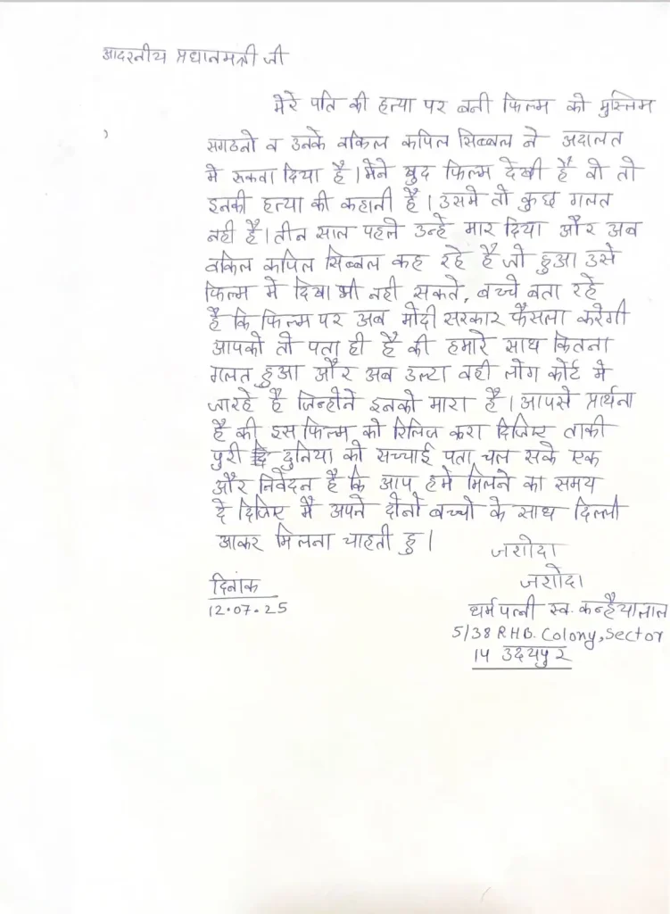 कन्हैया लाल की पत्नी ने पीएम को लिखा कि “मेरे पति की हत्या पर बनी फिल्म को मुस्लिम संगठनों व उनके वकील कपिल सिब्बल ने अदालत में रुकवा दिया है। मैंने खुद फिल्म देखी है। वो तो इनकी हत्या की कहानी है। उसमें तो कुछ गलत नहीं है।