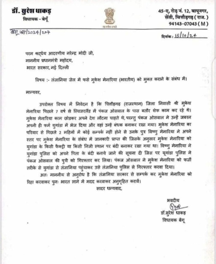 Rajasthan News: बेगू के विधायक डॉ. सुरेश धाकड़ ने तंजानिया में बंधक बनाए गए मुकेश मेनारिया की रिहाई के लिए प्रधानमंत्री नरेंद्र मोदी को एक पत्र लिखा है। पत्र में उन्होंने बताया कि मुकेश पिछले छह वर्षों से स्विट्जरलैंड में रसोइए का काम कर रहा था और भारत लौटना चाहता था, लेकिन उसे जबरन युगांडा भेज दिया गया, जहां उसे बंधक बनाकर रखा गया है। पिछले दो महीने से मुकेश का अपने परिवार से कोई संपर्क नहीं हो पाया है, जिससे उसके परिजन बेहद चिंतित हैं।