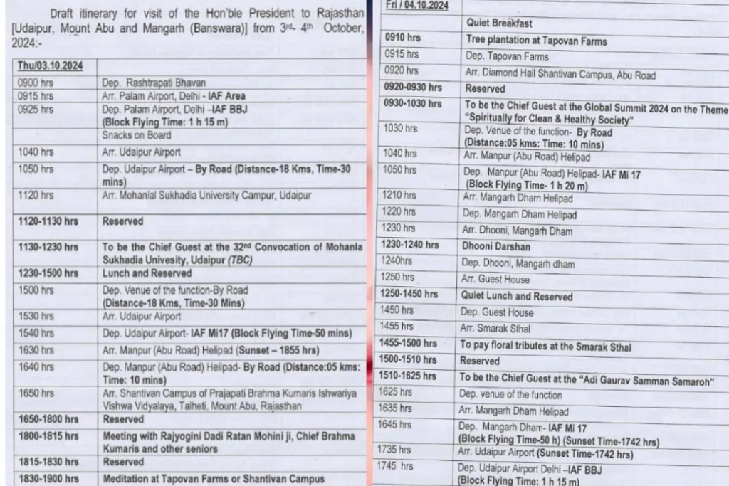 वहीं 4 अक्टूबर को, राष्ट्रपति माउंट आबू में प्रजापिता ब्रह्माकुमारी ईश्वरीय विश्वविद्यालय द्वारा आयोजित ‘स्वच्छ एवं स्वस्थ समाज के लिए आध्यात्मिकता’ विषय पर वैश्विक शिखर सम्मेलन में शामिल होंगी। इसके बाद बांसवाड़ा के मानगढ़ धाम में आयोजित आदि गौरव सम्मान समारोह में भी शिरकत करेंगी।