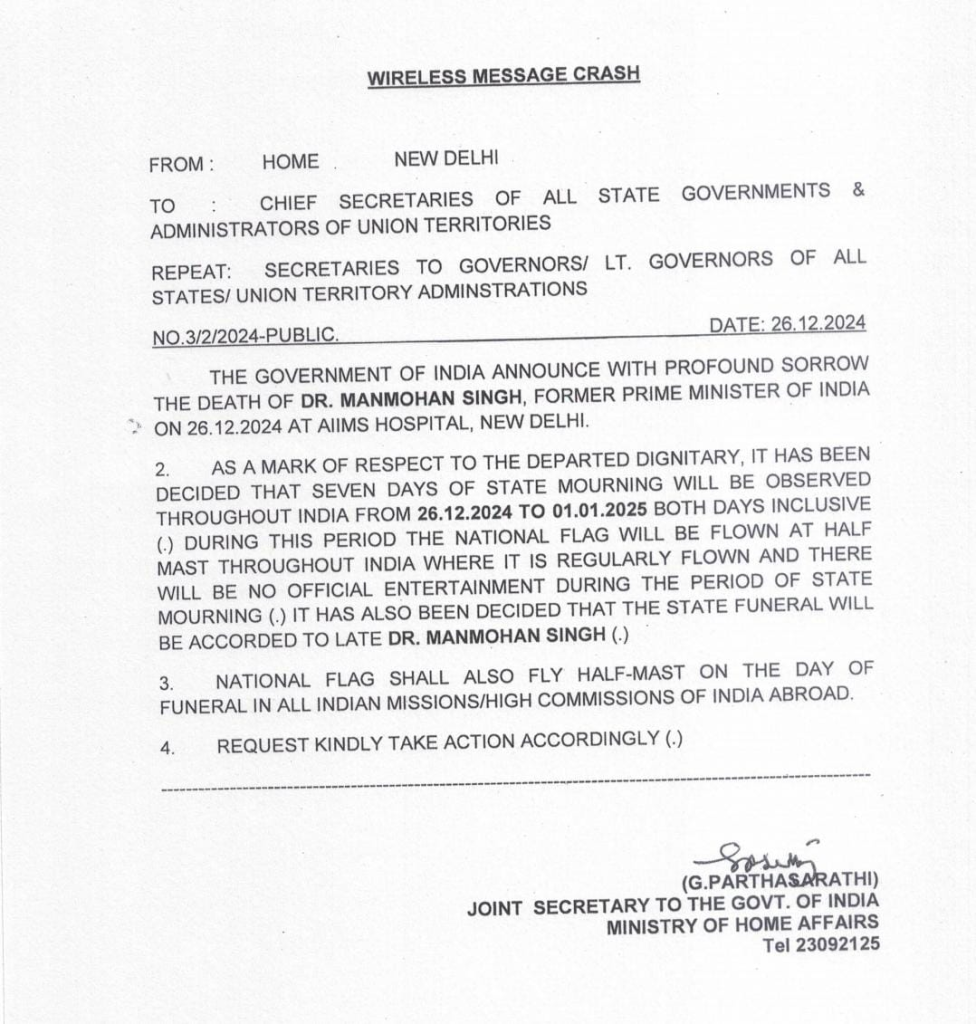 केंद्रीय गृह मंत्रालय द्वारा जारी आदेश में कहा गया कि पूर्व प्रधानमंत्री के निधन के कारण 7 दिन का राष्ट्रीय शोक घोषित किया गया है। इसी के तहत राजस्थान सहित अन्य राज्यों में भी शोक की अवधि के दौरान कई कार्यक्रम स्थगित किए गए हैं।