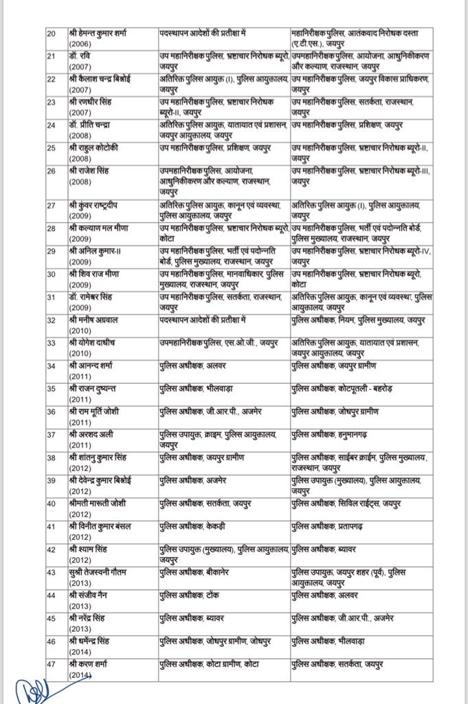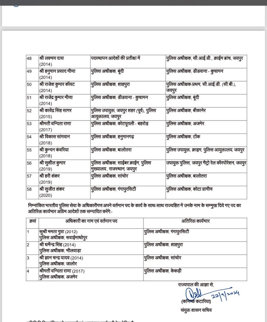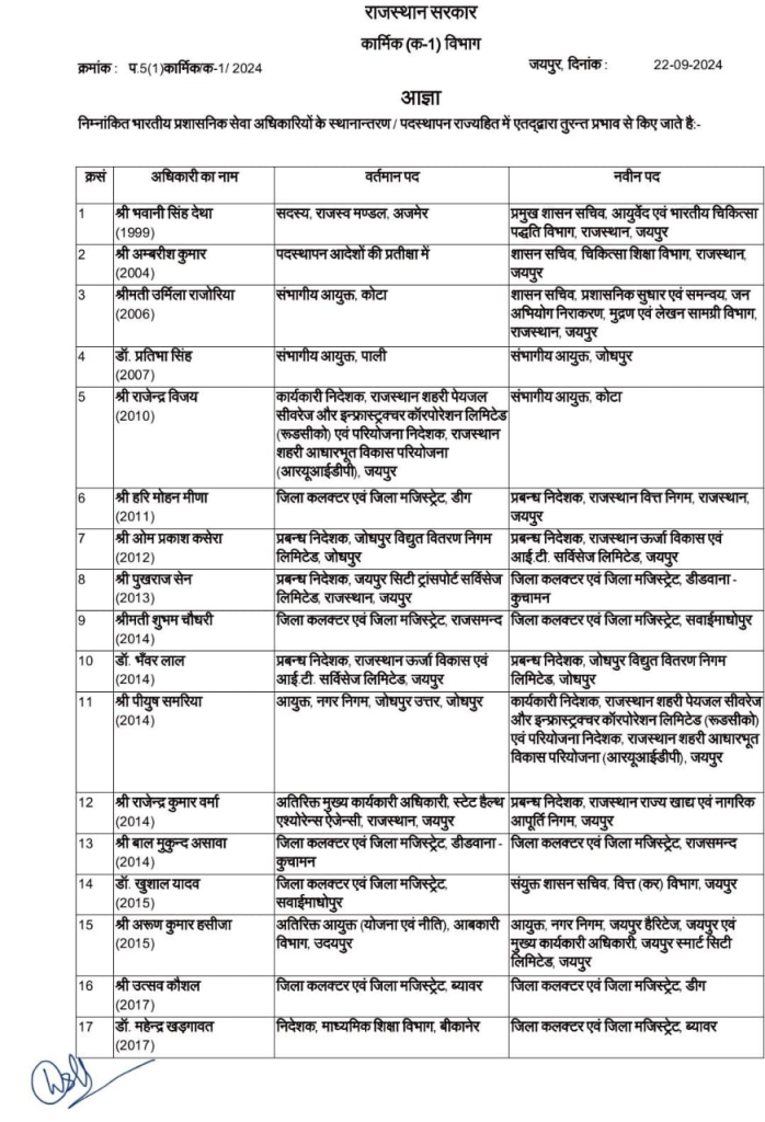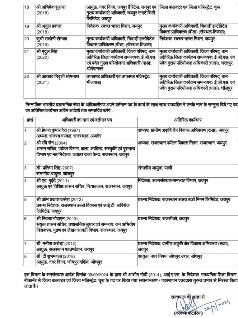 भवानी सिंह देथा को प्रमुख सचिव आयुर्वेद, अंबरीश कुमार को चिकित्सा शिक्षा विभाग का सचिव, और उर्मिला राजोरिया को सचिव प्रशासनिक सुधार बनाया गया है। जोधपुर और कोटा के संभागीय आयुक्तों के रूप में डॉ. प्रतिभा सिंह और राजेंद्र विजय को नियुक्त किया गया है। अन्य अधिकारियों में पुखराज सैन को डीडवाना-कुचामन का कलेक्टर, शुभम चौधरी को सवाई माधोपुर का कलेक्टर और बालमुकुंद असावा को राजसमंद का कलेक्टर बनाया गया है।