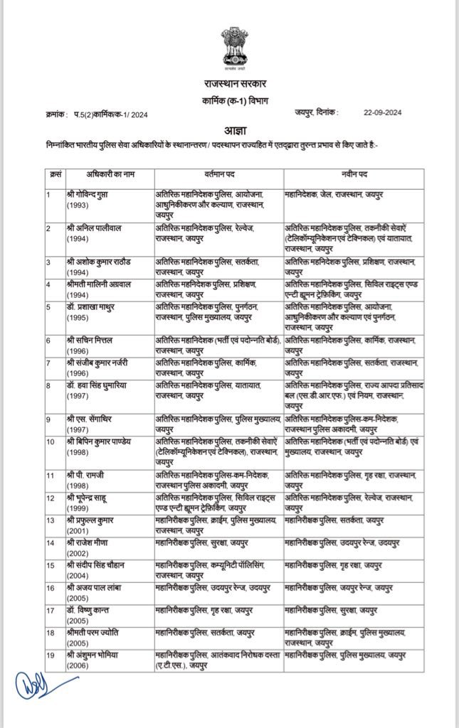गोविंद गुप्ता को डीजी जेल, अनिल पालीवाल को एडीजी ट्रैफिक, और अशोक राठौड़ को एडीजी ट्रेनिंग का पदभार सौंपा गया है। इसके अलावा, अजय पाल लाम्बा को आईजी जयपुर रेंज, आनंद कुमार को एसपी जयपुर ग्रामीण, और संदीप सिंह चौहान को आईजी गृह रक्षा का जिम्मा दिया गया है।