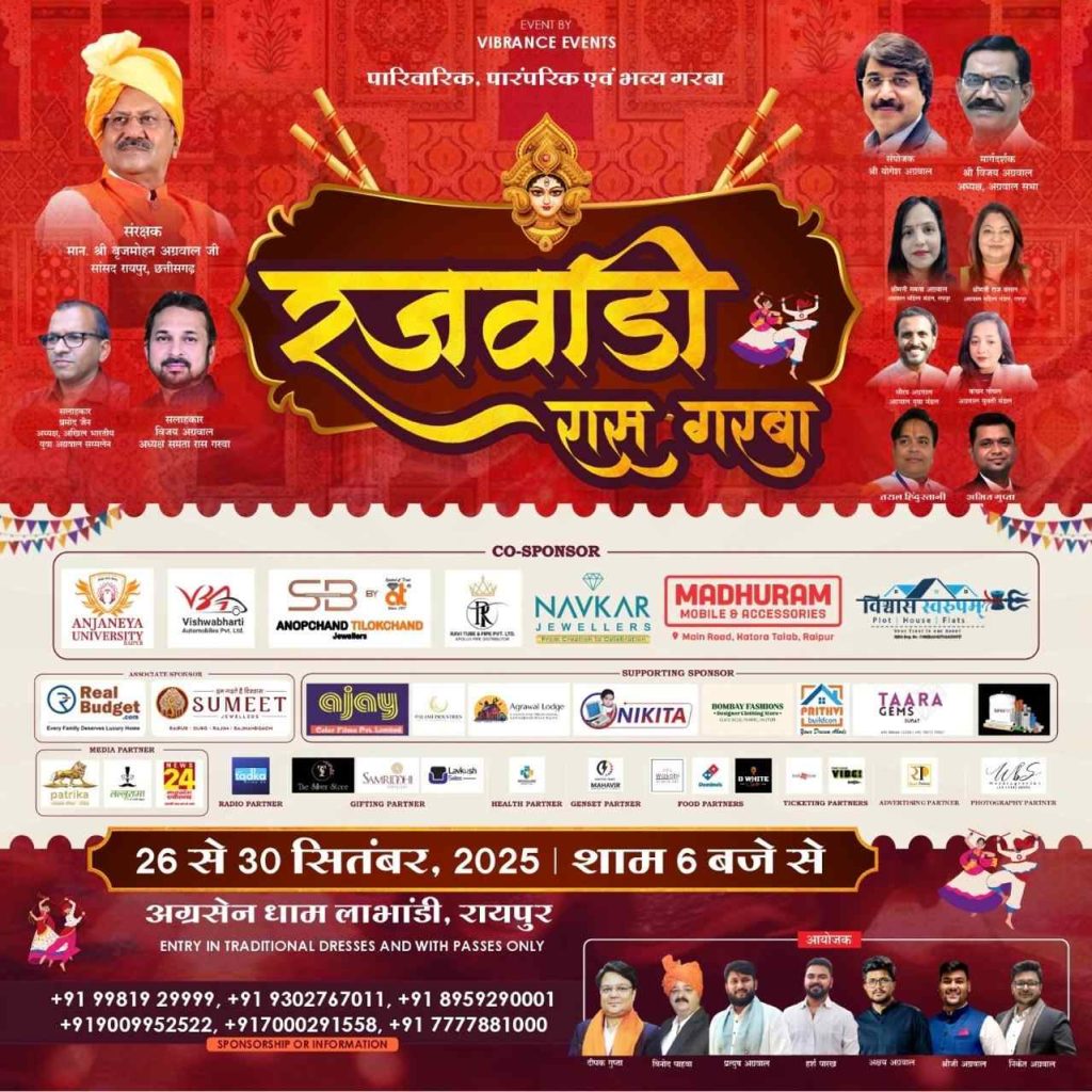 रायपुर। नवरात्रि पर्व पर रायपुरवासियों के लिए भक्ति, संस्कृति और परंपरा का अद्भुत संगम लेकर आ रहा है ‘राजवाड़ी रास गरबा 2025’। यह भव्य आयोजन Vibrance Events की ओर से किया जा रहा है, जो 26 से 30 सितंबर तक प्रतिदिन शाम 6 बजे से अग्रसेन धाम, लावाभांडी, रायपुर में आयोजित होगा। न्यूज 24 मध्यप्रदेश/छत्तीसगढ़ और लल्लूराम डॉट कॉम इस कार्यक्रम के मीडिया पार्टनर हैं।