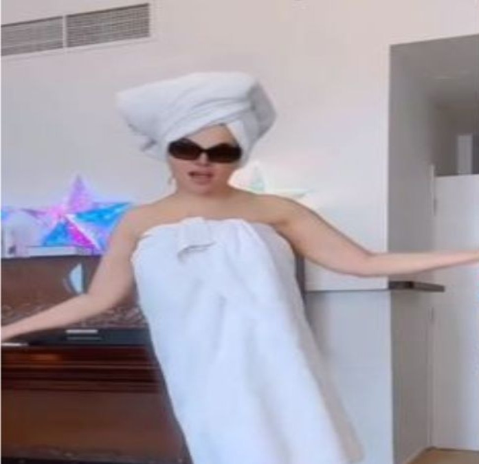 बता दें कि सोशल मीडिया पर वायरल हो रहे इस वीडियो में राखी सावंत (Rakhi Sawant) सिर पर और बॉडी पर टावल लपेट के घूमते दिख रही हैं. उन्होंने ब्लैक कलर के शेड्स लगाए हुए हैं. राखी सावंत (Rakhi Sawant) का ये लुक फैंस को भी बहुत पसंद आ रहा है.