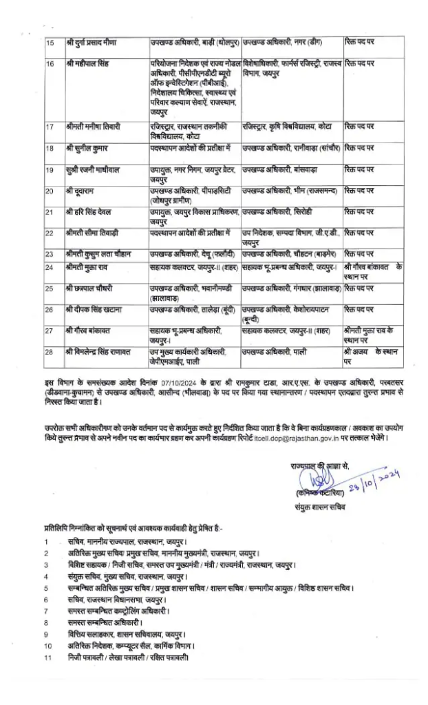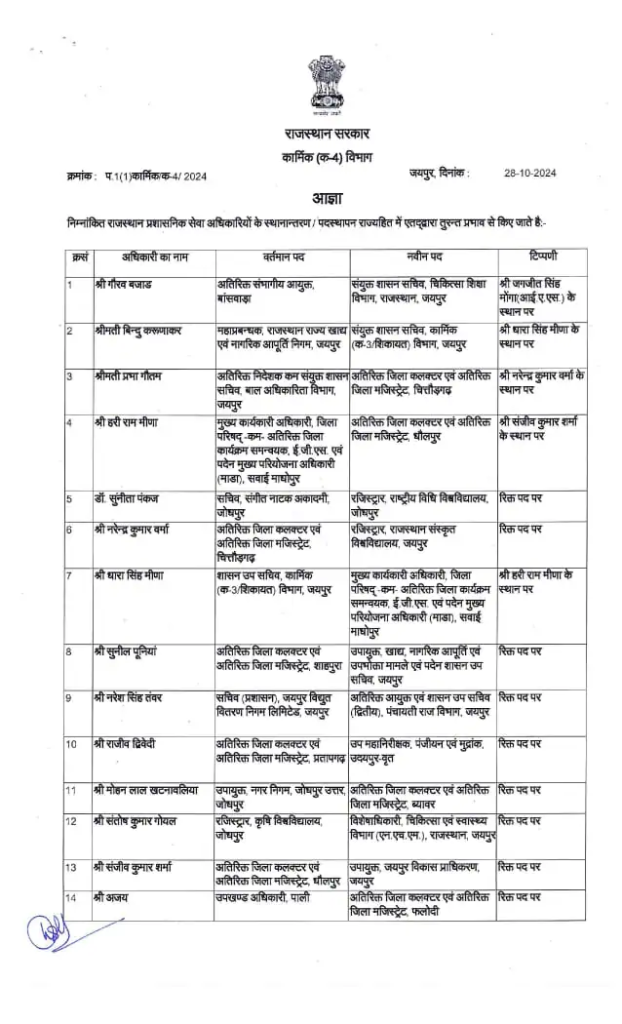 अक्टूबर के पहले सप्ताह में भजनलाल सरकार ने 83 RAS अधिकारियों की तबादले की सूची जारी की थी, जिसके बाद उपचुनाव की घोषणा से ठीक पहले 88 अधिकारियों का तबादला किया गया। अब, महीने के आखिरी सप्ताह में दिवाली से ठीक पहले 28 RAS अधिकारियों का स्थानांतरण किया गया है।