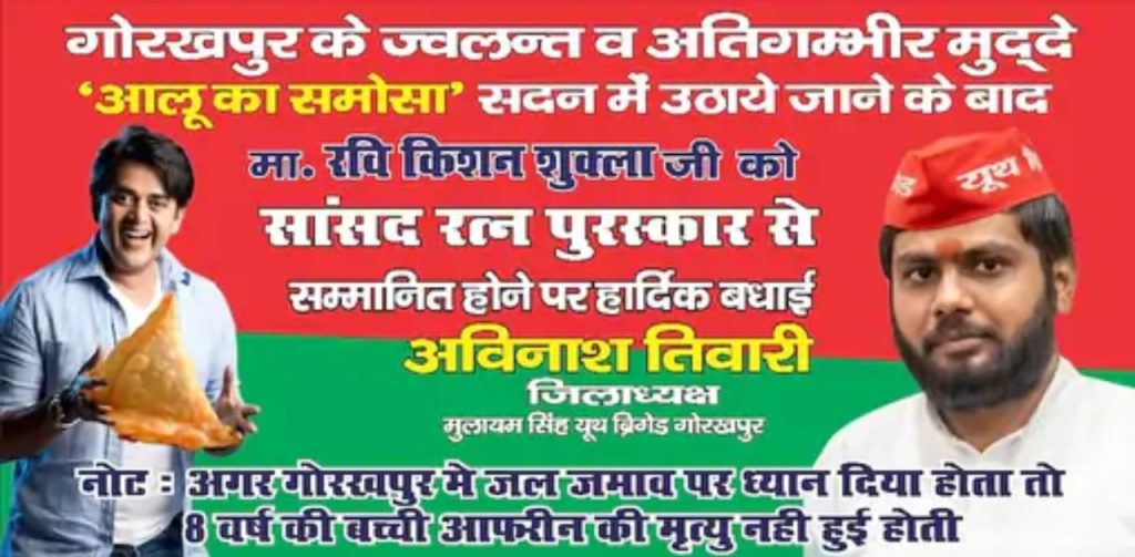 पोस्टर में रविकिशन के हाथ में बड़ा सा समोसा है. इस पोस्टर में नोट में लिखा है कि गोरखपुर के ज्वलन्त व अतिगंभीर मुद्दे आलू का समोसा सदन में उठाए जाने के बाद रविकिशन शुक्ल को सांसद रत्न पुरस्कार से सम्मानित होने पर हार्दिक बधाई. इसके बाद नीचे पोस्टर पर नोट में लिखा है कि अगर गोरखपुर में जलजमाव पर ध्यान दिया जाता तो 8 वर्ष की बच्ची आफरीन की मृत्यु नहीं हुई होती.