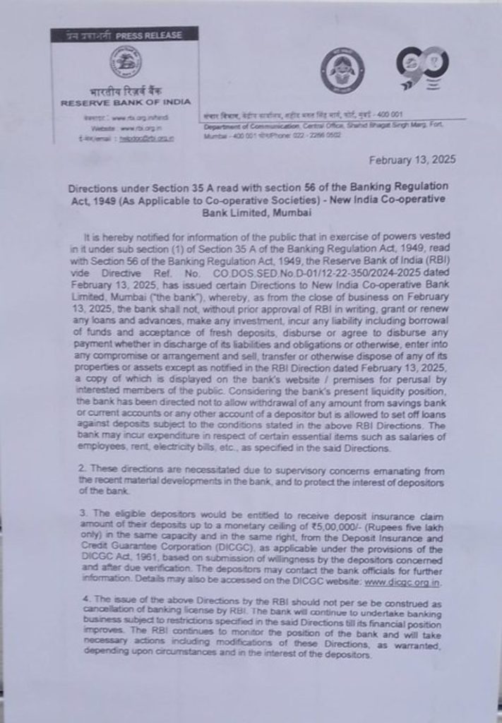RBI Ban On New India Co-operative Bank: भारतीय रिजर्व बैंक (RBI) ने मुंबई के न्यू इंडिया कॉ-आपरेटिव बैंक (सहकारी बैंक) पर प्रतिबंध लगा दिया है। अब कोई भी कस्टमर्स इस बैंक से पैस विड्रॉल नहीं कर सकता। इसकी जानकारी अकाउंट होल्डर्स तक पहुंची, बैंकों से पैसा निकालने के लिए ग्राहकों की लाइन लग गई। मुंबई में न्यू इंडिया कॉ-आपरेटिव बैंक के बाहर जमा अधिकांश ग्राहक यही पूछते नजर आए कि जिंदगी भर की कमाई का जमा पैसा अब वापस मिलेगा या नहीं? मिलेगा तो कब?
