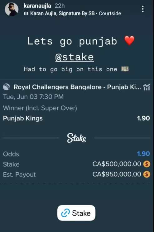 बता दें कि करण औजला (Karan Aujla) ने अपने इंस्टाग्राम स्टोरी पर एक स्क्रीनशॉट शेयर किया और बताया कि उन्होंने पंजाब किंग्स (PBKS) पर कितना स्टेक लगाया था. खबरों की मानें तो सिंगर ने पंजाब किंग्स (PBKS) पर करीब 3 करोड़ रुपए की बेट लगाई थी. लेकिन जब जीत RCB की हुई है, तो करण औजला (Karan Aujla) के 3 करोड़ रुपए डूब गए.