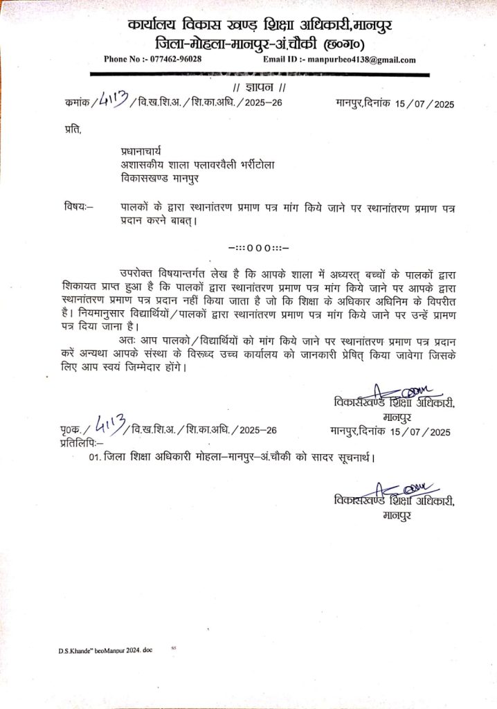 प्रमोद निर्मल, मोहला-मानपुर-अंबागढ़ चौकी। भर्रीटोला स्थित फ्लावर वैली इंग्लिश मीडियम स्कूल की मनमानी पर अब आखिरकार शिक्षा विभाग की नजर गई है। पिछले कई हफ्तों से आदिवासी व ग्रामीण पालकों की लगातार शिकायतों और मीडिया रिपोर्ट्स के बाद मानपुर के विकासखंड शिक्षा अधिकारी ने स्कूल प्रबंधन को सख्त चेतावनी देते हुए स्थानांतरण प्रमाण पत्र (टीसी) देने का स्पष्ट आदेश जारी कर दिया है।