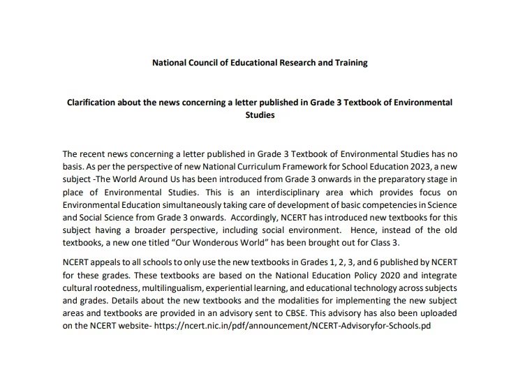 चिट्ठी को लेकर मचे बवाल के बीच एनसीईआरटी ने सफाई दी है। काउंसिल ने कहा कि पर्यावरण अध्ययन की ग्रेड 3 की किताब में पब्लिश एक लेटर से संबंधित हाल ही में आई खबर का कोई आधार नहीं है।