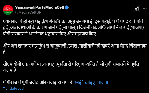 सपा के मीडिया सेल ने X पर इस संबंध में पोस्ट किया है. जिसमें लिखा है कि ‘प्रयागराज में हो रहा महाकुंभ गैंगवॉर का अड्डा बन गया है, इस महाकुंभ में भगदड़ में मौतें हुईं, अव्यवस्थाओं के कारण जानें गईं, ना मालूम कितनी तकलीफें लोगों ने उठाईं, भाजपा/योगी सरकार ने अनगिनत भ्रष्टाचार किए और महापाप किए और अब लगातार महाकुंभ से चाकूबाजी, हमले, गोलीबारी की खबरें आना बेहद चिंताजनक है.’ आगे उन्होंने लिखा है कि सीएम योगी यूपी संभालने में पूर्णतः अक्षम हैं. ‘योगी राज में यूपी बर्बाद और तबाह हो गया है’