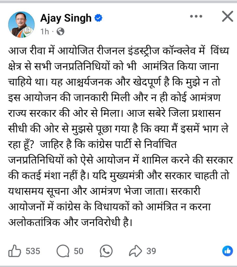 पूर्व नेता प्रतिपक्ष और कांग्रेस के चुरहट से विधायक अजय सिंह ने सोशल मीडिया पर लिखा, “आज रीवा में आयोजित रीजनल इंडस्ट्रीज कॉन्क्लेव में विंध्य क्षेत्र से सभी जनप्रतिनिधियों को भी आमंत्रित किया जाना चाहिए था। यह आश्चर्यजनक और खेदपूर्ण है कि मुझे न तो इस आयोजन की जानकारी मिली और न ही कोई आमंत्रण राज्य सरकार की ओर से मिला।”