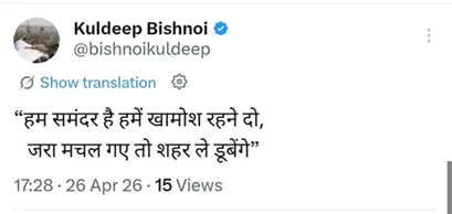 पूरे घटनाक्रम के बीच कुलदीप बिश्नोई ने सीधे तौर पर कुछ न कहते हुए अपने सोशल मीडिया हैंडल ‘X’ पर एक शेर साझा कर अपनी नाराजगी और इरादे स्पष्ट कर दिए हैं। उन्होंने लिखा, “हम समंदर हैं हमें खामोश रहने दो, जरा मचल गए तो शहर ले डूबेंगे।” इस पोस्ट को रेखा शर्मा के बयान के खिलाफ एक सशक्त जवाब के रूप में देखा जा रहा है। हालांकि कुलदीप बिश्नोई वर्तमान में भाजपा का हिस्सा हैं, लेकिन पिता के सम्मान के मुद्दे पर वे अपने भाई चंद्रमोहन और समर्थकों के साथ एकजुट नजर आ रहे हैं। आने वाले दिनों में यदि भाजपा नेतृत्व ने इस पर ठोस कदम नहीं उठाया, तो यह विवाद पार्टी के चुनावी समीकरणों पर भारी पड़ सकता है।