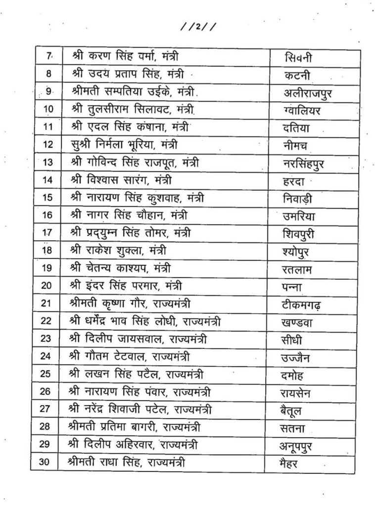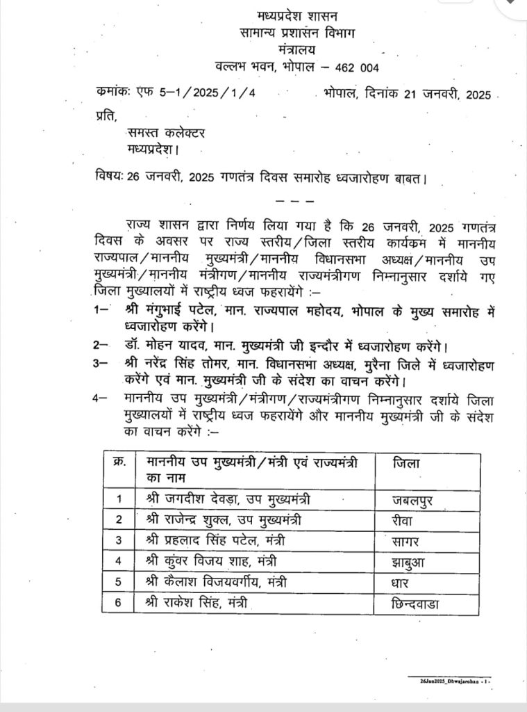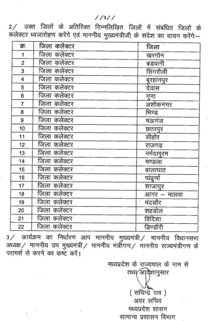 आदेश के अनुसार प्रह्लाद पटेल सागर में, कुंवर विजय शाह झाबुआ में, धार में कैलाश विजयवर्गीय और राकेश सिंह छिंदवाड़ा में ध्वजारोहण करेंगे। वहीं, खरगोन, बड़वानी, देवास समेत कई जिलों में कलेक्टर तिरंगा फहराएंगे।