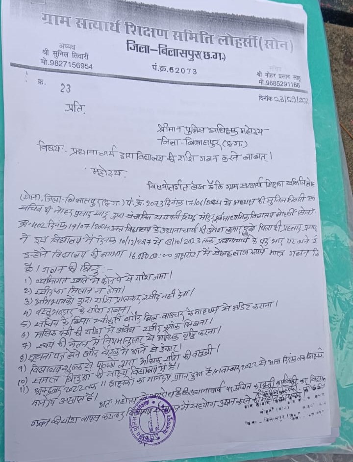 वीरेन्द्र गहवई, बिलासपुर। बिलासपुर जिले के पचपेड़ी थाना क्षेत्र से बेहद ही चौंकाने वाला मामला सामने आया है, जिसमें सरस्वती शिशु मंदिर के पूर्व प्रधान प्रचार ने स्कूल प्रबंधन को करीब 10 लाख रुपये का चुना लगा दिया। यह पूरा मामला सन 2023 का है, जिसमें पचपेड़ी के ग्राम सोन लोहरसी में स्थित सरस्वती शिशु मंदिर के पूर्व प्रधानाचार्य उमेश कुमार दुबे ने स्कूल में पढ़ाने वाले शिक्षकों की तंखा और स्कूली बच्चे के परिजनों द्वारा जमा की गई। फीस के पैसे गबन कर रफू चक्कर हो गया। स्कूल के पैसे गबन करने वाला प्रधानाचार्य उमेश कुमार दुबे 2 साल से फरार है।