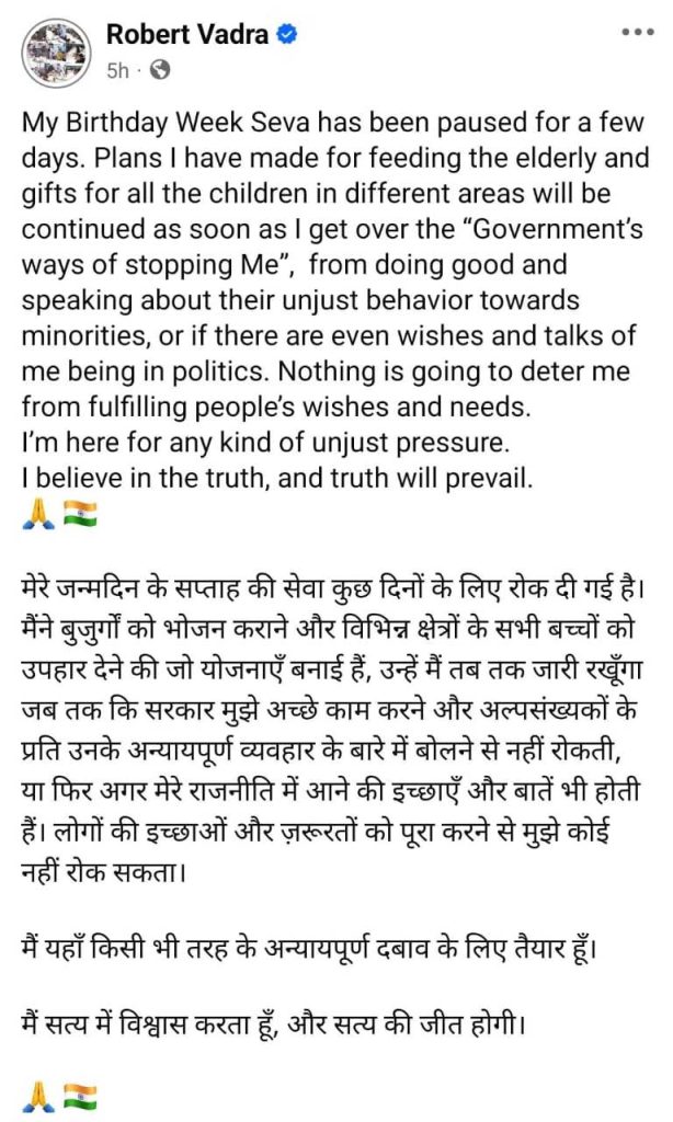 वाड्रा ने एक फेसबुक पोस्ट में उल्लेख किया कि उनके जन्मदिन के सप्ताह में समाजसेवा की जो योजनाएं उन्होंने बनाई थीं, उन्हें अस्थायी रूप से रोकना पड़ा है. उन्होंने बताया कि उन्होंने बुजुर्गों को भोजन प्रदान करने और बच्चों को उपहार देने का कार्यक्रम तैयार किया था, जिसे वह तब तक जारी रखेंगे जब तक सरकार उन्हें अच्छे कार्य करने या अल्पसंख्यकों के प्रति हो रहे अन्याय के बारे में बोलने से नहीं रोकती.