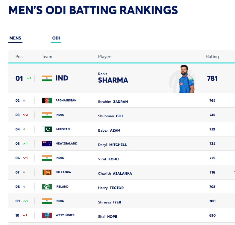 आईसीसी की ओर से जारी आंकड़ों के अनुसार, रोहित शर्मा ने इस बार रैंकिंग में दो स्थान की छलांग लगाई है। उनकी रेटिंग बढ़कर 781 अंक हो गई है। खास बात यह है कि रोहित शर्मा ने अपने करियर में पहली बार वनडे रैंकिंग में शीर्ष स्थान प्राप्त किया है।