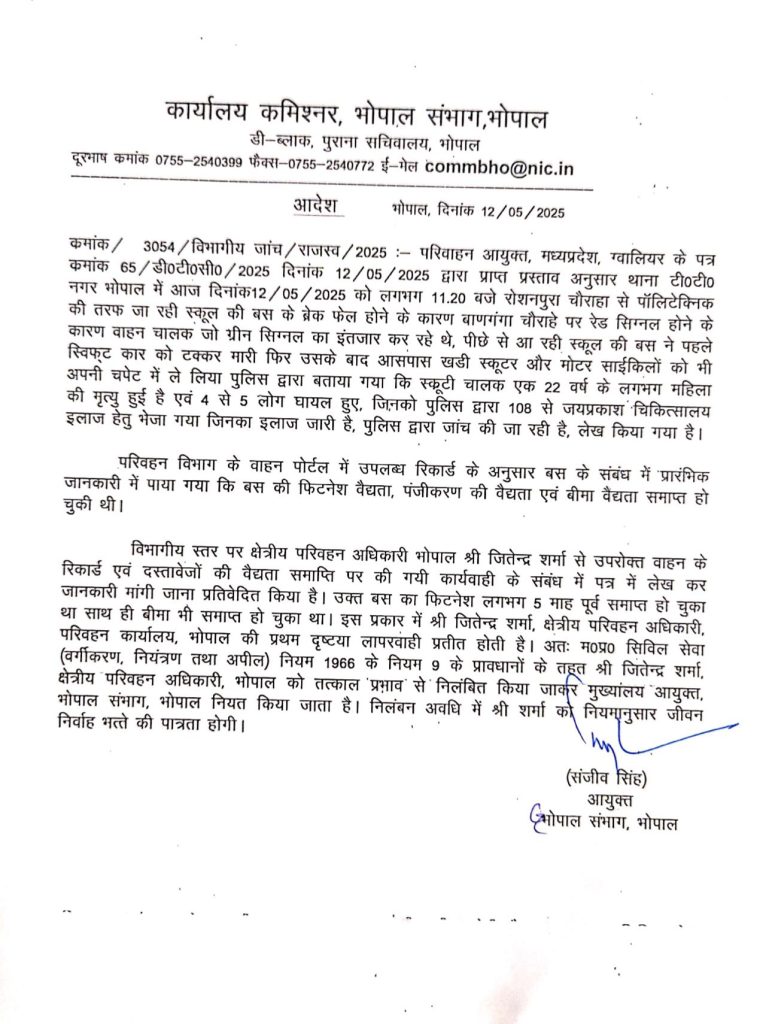 शब्बीर अहमद, भोपाल। मध्य प्रदेश की राजधानी भोपाल में हुए सड़क हादसे में बड़ी कार्रवाई की गई है। आरटीओ जितेंद्र शर्मा को सस्पेंड कर दिया गया है। संभाग आयुक्त ने यह कार्रवाई की है। बताया गया कि बस बिना फिटनेस के दौड़ रही थी। पंजीयन और बीमा भी खत्म हो चुका था। वहीं बस मालिक और चालक पर एफआईआर दर्ज की गई है।