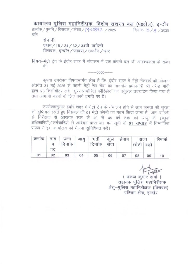 उपरोक्तानुसार इंदौर शहर में मेट्रो ट्रेन के संचालन होने से आम जनता की सुरक्षा को दृष्टिगत रखते हुए विसबल की 01 मेट्रो कंपनी का गठन किया जाना है। अतः वाहिनी से निरीक्षक से आरक्षक स्तर के 40 से 45 वर्ष तक की आयु के इच्छुक अधिकारियों / कर्मचारियों से आवेदन प्राप्त कर मय सूची के 01 सप्ताह में निम्नांकित प्रारूप में इस कार्यालय को भेजना सुनिश्चित करें।