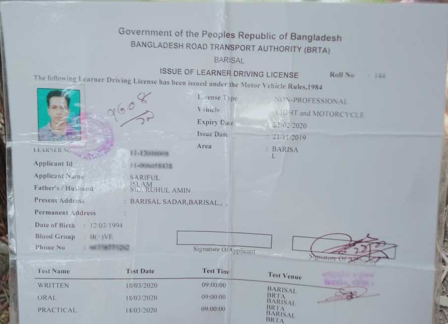 ड्राइविंग लाइसेंस को बरीसाल ट्रांसपोर्ट अथॉरिटी, बांग्लादेश ने 21 नवंबर 2019 को शरीफुल इस्लाम को जारी किया था। य़ह 21 फरवरी 2020 तक वैध था। ये दोपहिया वाहन का लर्निंग लाइसेंस था। लाइसेंस नंबर 144 है. शरीफुल इस्लाम के पिता का नाम मोहम्मद रूल हमीद है। शरीफुल ने बरीसाल ट्रांसपोर्ट अथॉरिटी में लिखित, मौखिक और प्रैक्टिकल तीनों परीक्षाएं दी थीं. इन परीक्षाओं को पास करने के बाद उसे स्थायी ड्राइविंग लाइसेंस जारी किया गया था। इस लाइसेंस पर शरीफुल इस्लाम का नाम बांग्ला और अंग्रेजी दोनों भाषाओं में लिखा हुआ है।