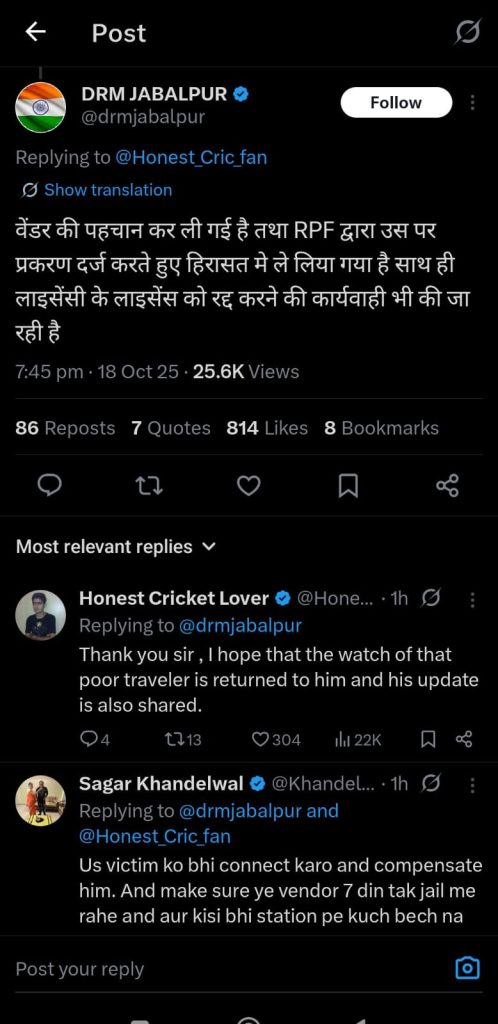 रेल यात्री से समोसे के पहले घड़ी छुड़ाने की शर्मनाक घटना का वीडियो भी सामने आया है। वीडियो के बाद रेल महकमा हरकत में आया। जबलपुर के DRM ने ट्वीट कर समोसा बेचने वाले वेंडर की शिनाख्त करने और कार्रवाई की जानकारी दी है। मामला सामने आने के बाद RPF ने आरोपी समोसा वेंडर के खिलाफ मामला दर्जकर गिरफ्तार कर लिया है। आरोपी वेंडर का लाइसेंस निरस्त करने की भी कार्रवाई की जा रही है।