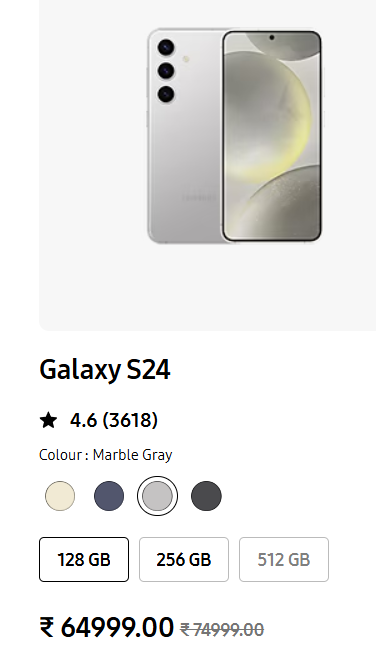 Samsung Galaxy S24 (Marble Gray, 8GB RAM + 256GB स्टोरेज) – ₹59,784