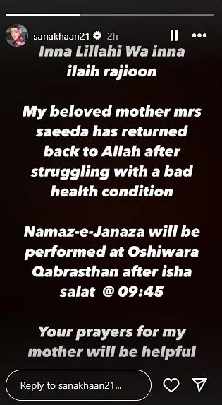 टीवी और बॉलीवुड की दुनिया का अहम हिस्सा रह चुकीं सना खान (Sana Khan) ने अपनी इंस्टाग्राम स्टोरी पर एक पोस्ट शेयर करते हुए लिखा ‘इन्ना लिल्लाहि वा इन्ना इलैह राजिउन. मेरी प्यारी मां सईदा खराब स्वास्थ्य स्थिति से जूझने के बाद अल्लाह के पास वापस लौट आई हैं. नमाज-ए-जनाजा ईशा की नमाज के बाद ओशिवारा कब्रिस्तान में 09:45 बजे अदा की जाएगी. मेरी मां के लिए आपकी दुआएं मददगार होंगी.’