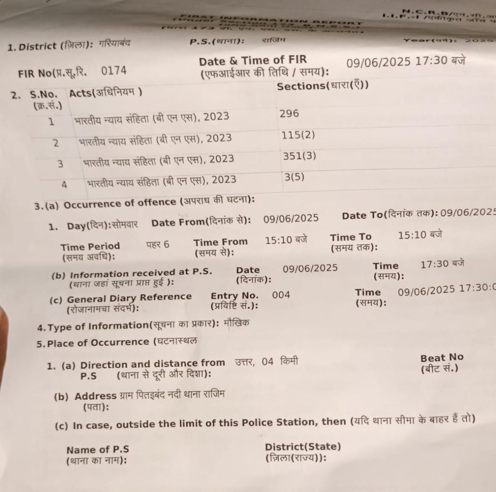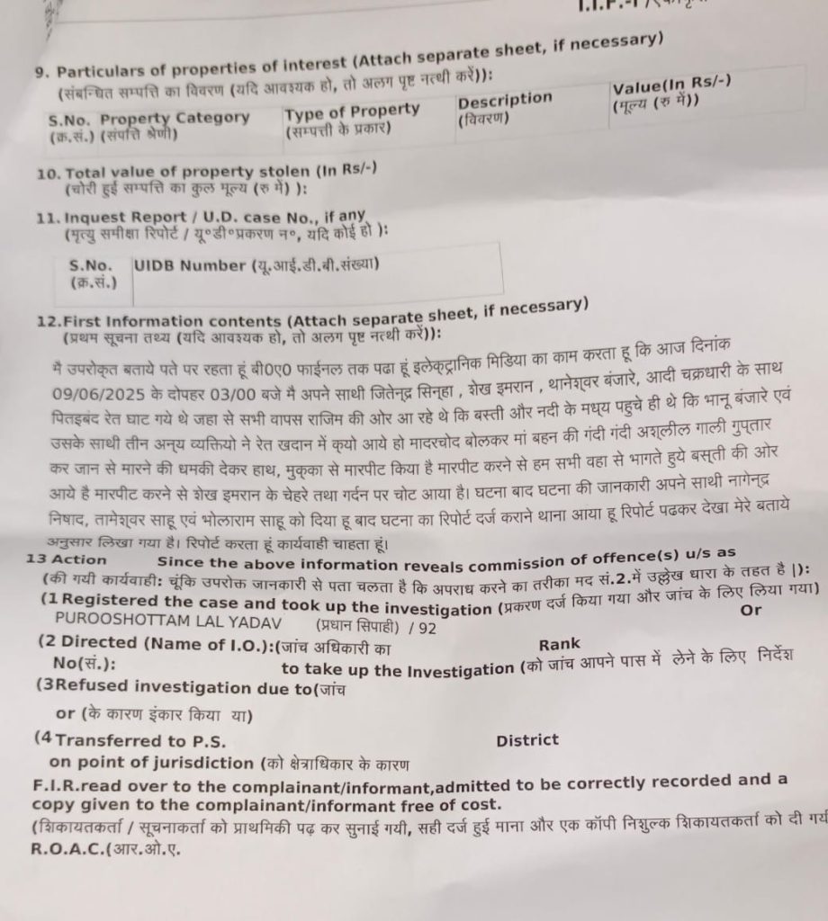 बता दें, गरियाबंद जिले के पितईबंद घाट (पैरी नदी) में 9 जून 2025 (सोमवार) को अवैध रेत उत्खनन की रिपोर्टिंग करने गए पत्रकारों पर खदान संचालक के गुर्गों ने जानलेवा हमला किया था. गुर्गों ने न सिर्फ पत्रकारों के कैमरे और पहचान पत्र छीन लिए, बल्कि उन्हें दौड़ा-दौड़ाकर पीटा. जान बचाने के लिए पत्रकारों को खेतों और खलिहानों में जाकर छिपना पड़ा था. रिपोर्टिंग करने गए पत्रकारों में शेख इमरान, थानेश्वर साहू, जितेंद्र सिन्हा और अन्य मीडियाकर्मी शामिल थे.