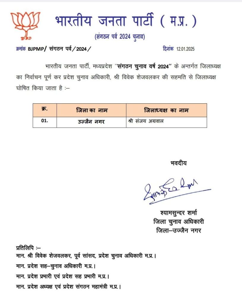 सुधीर दंडोतिया, भोपाल। MP BJP Jila Adhyaksh: मध्य प्रदेश में भाजपा जिला अध्यक्ष की नियुक्ति का इंतजार खत्म हो गया है। उज्जैन से सबसे पहले जिला अध्यक्ष के नाम की घोषणा की गई है। मुख्यमंत्री डॉ. मोहन यादव के करीबी संजय अग्रवाल को जिला अध्यक्ष की जिम्मेदारी दी गई है।