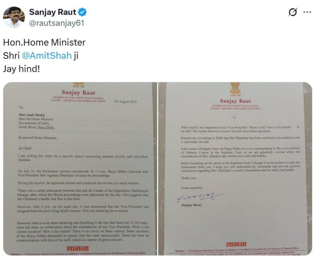 राउत ने यह भी कहा कि राज्यसभा के कुछ सदस्य सुप्रीम कोर्ट में हैबियस कॉर्पस याचिका दाखिल करने पर विचार कर रहे हैं, ताकि धनखड़ की मौजूदगी और सुरक्षा की पुष्टि हो सके। उन्होंने लिखा, ‘सुप्रीम कोर्ट का दरवाजा खटखटाने से पहले मैंने सोचा कि यह जानकारी आपसे लेना उचित होगा। उम्मीद है कि आप मेरी भावना को समझेंगे और धनखड़ साहब की मौजूदा स्थिति, सुरक्षा और सेहत को लेकर सही जानकारी देंगे।