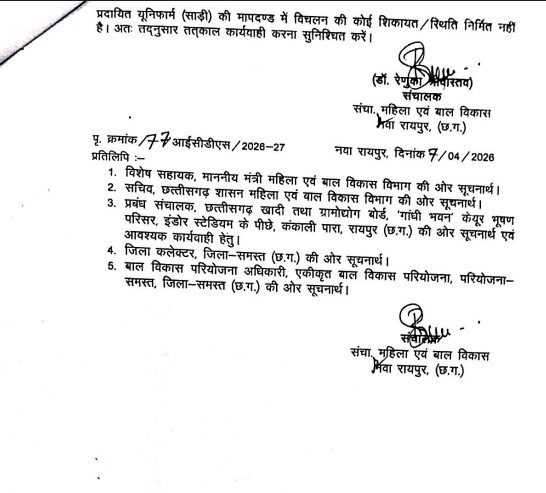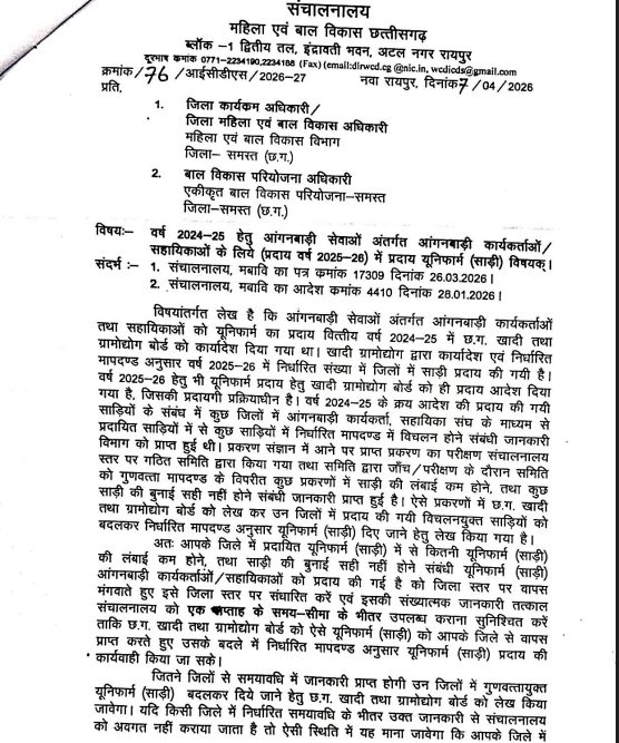 रायपुर। छत्तीसगढ़ में आंगनबाड़ी कार्यकर्ताओं और सहायिकाओं को यूनिफॉर्म (साड़ी) वितरण को लेकर बड़ा प्रशासनिक उलटफेर सामने आया है। महिला एवं बाल विकास विभाग द्वारा पहले जहां वर्ष 2024-25 में 500 रुपये प्रति साड़ी की दर से यूनिफॉर्म वितरण की स्वीकृति दी गई थी, वहीं अब उन्हीं साड़ियों की गुणवत्ता पर सवाल उठने के बाद नए आदेश में उन्हें वापस मंगाकर बदलने के निर्देश दिए गए हैं।