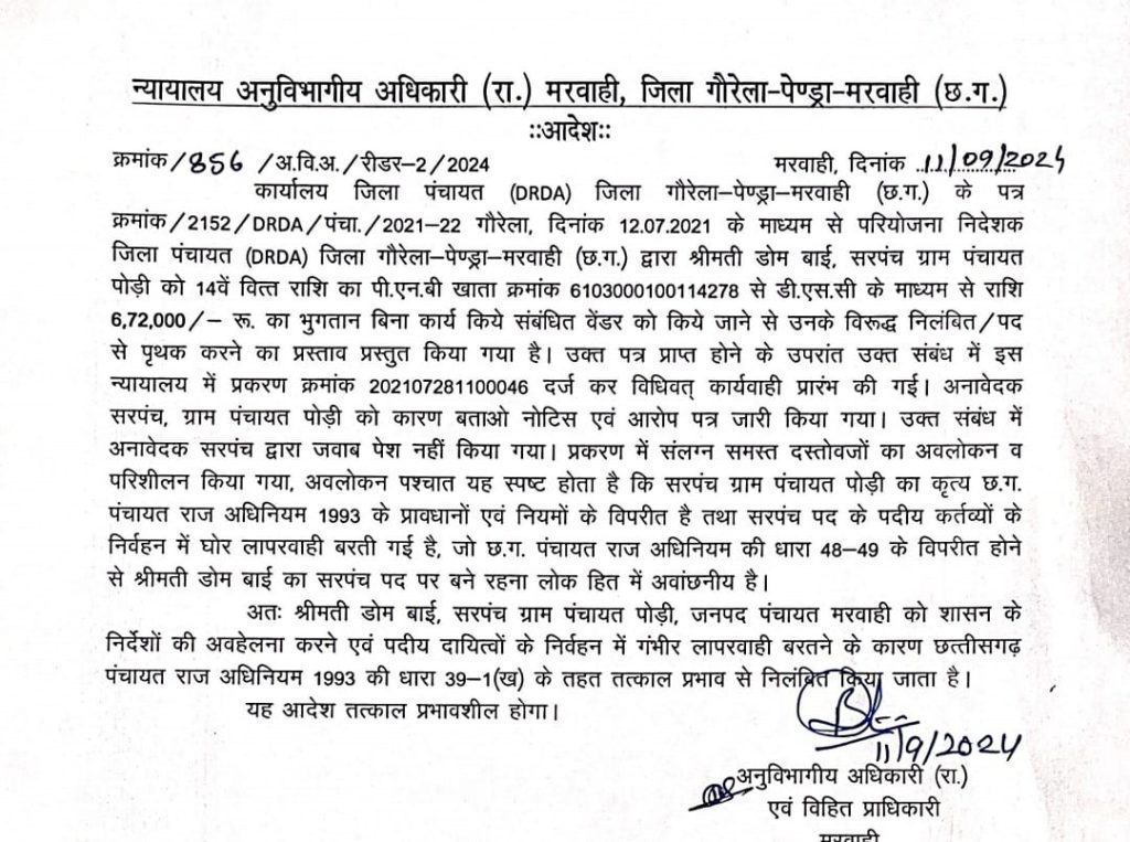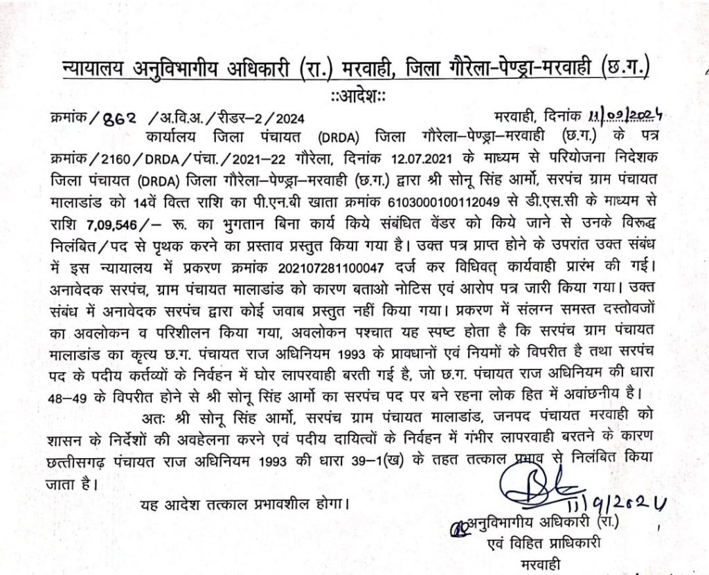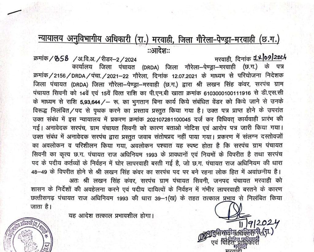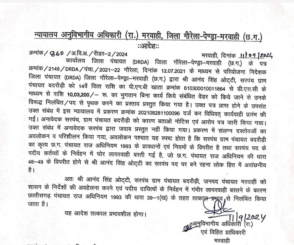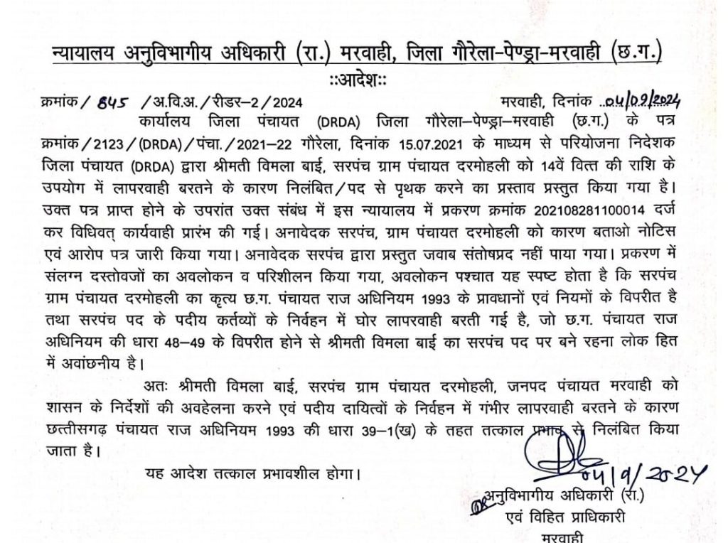 गौरेला पेंड्रा मरवाही. छत्तीसगढ़ पंचायत राज अधिनियम के तहत मरवाही जनपद के पांच ग्राम पंचायतों के सरपंचों को आज उनके पदीय कर्तव्यों में घोर लापरवाही बरतने के आरोप में निलंबित कर दिया गया है. निलंबित किए गए सरपंचों में बदरौडी, सिवनी, पोड़ी, मालाडाड और दमोहली ग्राम पंचायतों के सरपंच शामिल हैं.