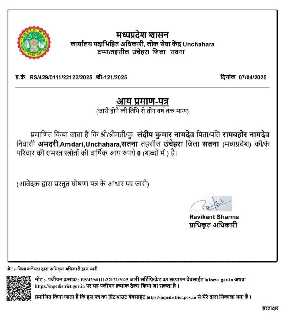 सतना जिले की कोठी तहसील के आय प्रमाण पत्र का मामला अभी ठंडा नहीं हुआ था कि उचेहरा तहसील से एक ऐसी खबर निकलकर सामने आई जिससे लोगों को सोचने पर मजबूर कर दिया है। दरअसल, उचेहरा तहसील के अमदरी गांव के निवासी संदीप कुमार नामदेव पिता रामबहोर नामदेव को आय प्रमाण पत्र जारी हुआ। जिसमें उसकी सालाना आमदनी शून्य रुपये लिखी थी।