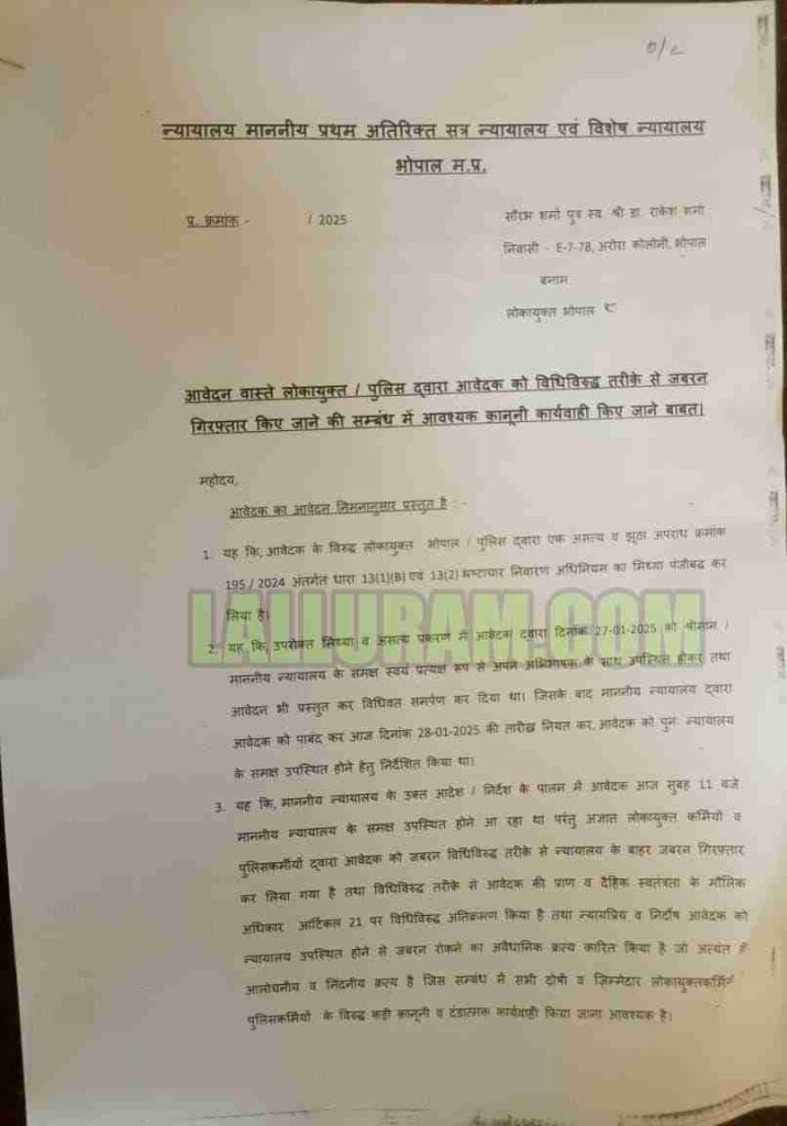 आवेदन में कहा, “आवेदक को न्यायालय उपस्थित होने से जबरन रोकने व विधि विरुद्ध तरीके से गिरफ्तार किए जाने, जैसे अवैधानिक और विधिविरुद्ध कृत्य किए जाने के सम्बंध में सम्बंधित सभी दोषी लोकायुक्त कर्मियों और पुलिसकर्मियों के खिलाफ आवश्यक व कड़ी कानूनी कार्यवाही किए जाने की कृपा करें, ताकि आमजन का भरोसा व विश्वास कानून व न्यायालयीन प्रक्रिया में कायम बना रहे।”