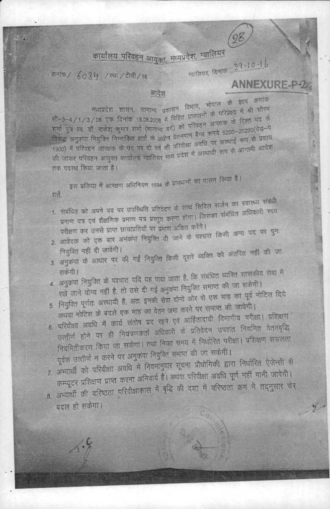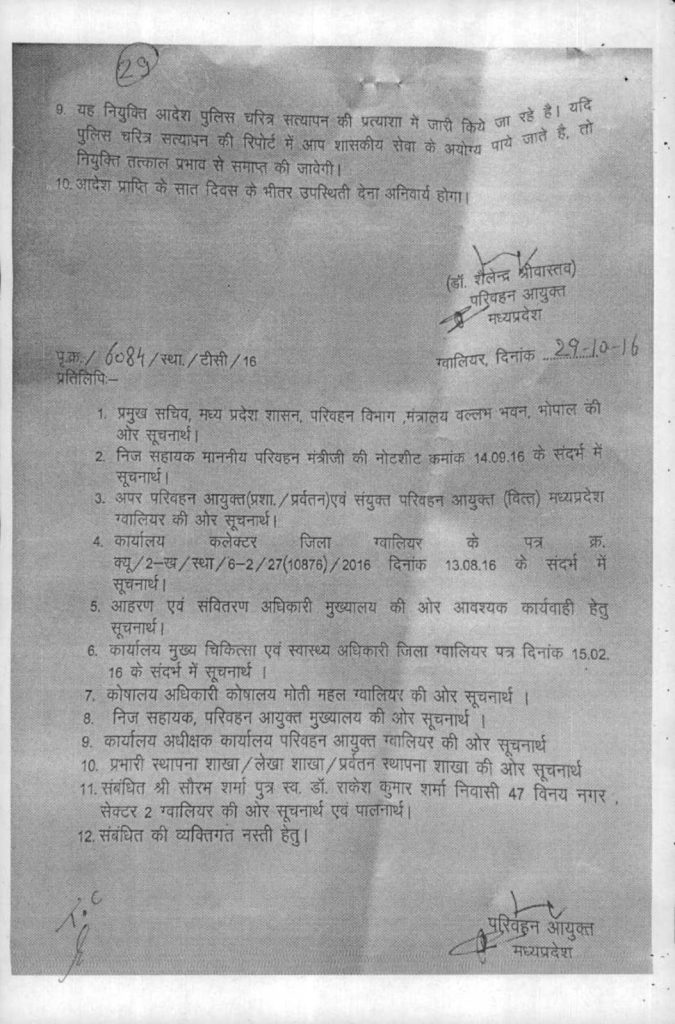 राकेश चतुर्वेदी, भोपाल। काली कमाई से करोड़ों रुपये इकट्ठा करने आरोपित पूर्व आरटीओ कांस्टेबल सौरभ शर्मा मामले में आए दिन नए-नए खुलासे हो रहे हैं। इसी बीच पूर्व परिवहन आरक्षक का नियुक्ति पत्र सोशल मीडिया पर वायरल हो रहा है।सौरभ शर्मा का नियुक्ति पत्र 29 अक्टूबर 2016 को जारी किया गया था, और उन्हें अस्थाई तौर पर दो वर्ष के लिए नियुक्त किया गया था। यह नियुक्ति आदेश तत्कालीन परिवहन आयुक्त शैलेन्द्र श्रीवास्तव द्वारा जारी किया गया था।